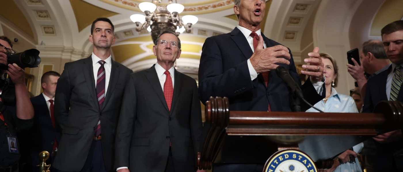 Senate Majority Leader John Thune (R-SD) speaks to reporters at Capitol Hill on June 24, 2025 in Washington.