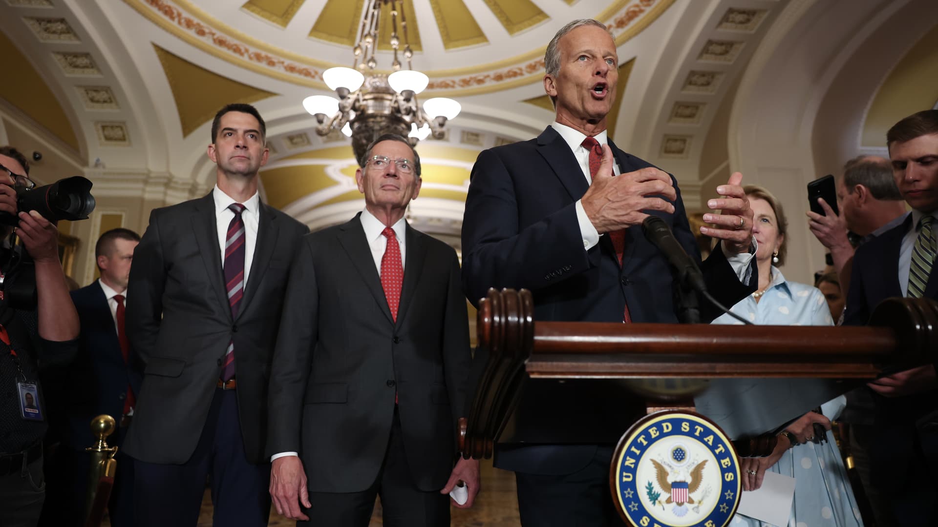Senate Majority Leader John Thune (R-SD) speaks to reporters at Capitol Hill on June 24, 2025 in Washington.