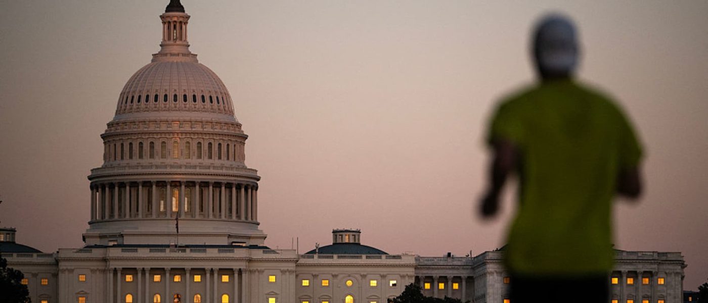The sunset is reflected in the windows of the US Capitol as a man runs on the National Mall in Washington, DC, on October 1, 2025, the first day of the US federal government shutdown.