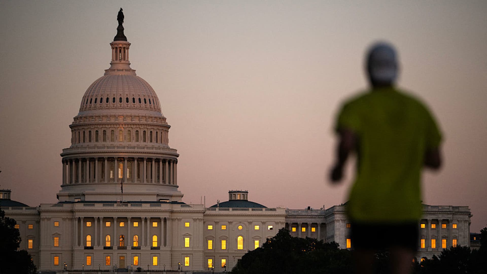 The sunset is reflected in the windows of the US Capitol as a man runs on the National Mall in Washington, DC, on October 1, 2025, the first day of the US federal government shutdown.