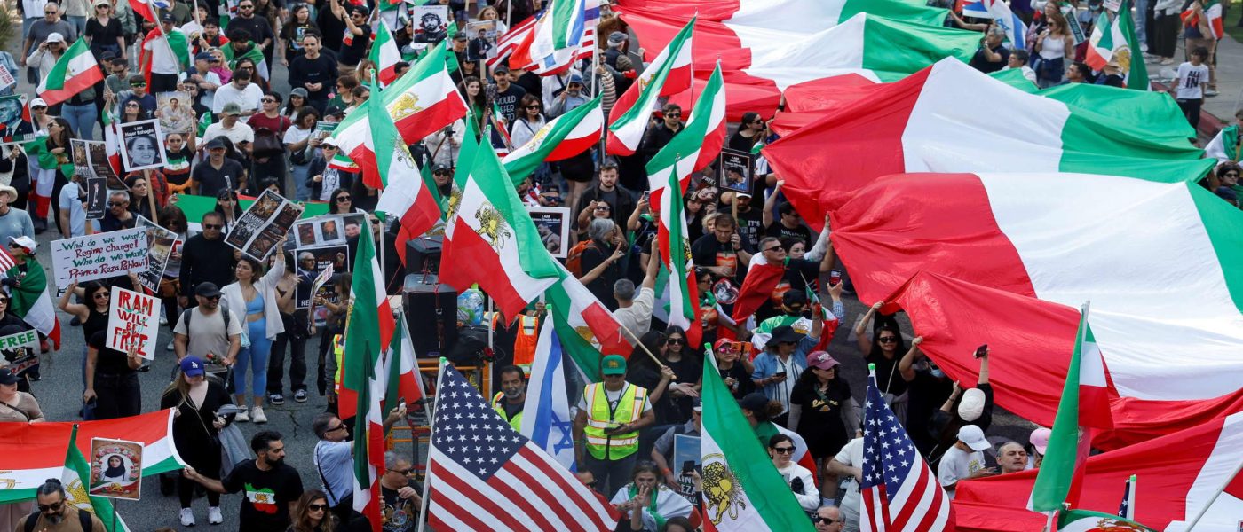 People take part in a rally in support of Iranian protesters during a global day of action in Los Angeles, California, on Feb. 14, 2026.