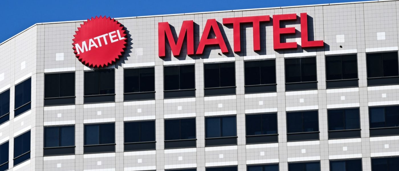 The Mattel, Inc. logo is displayed outside the headquarters of the toy company known for products including Barbie and Hot Wheels in El Segundo, California on June 8, 2023.