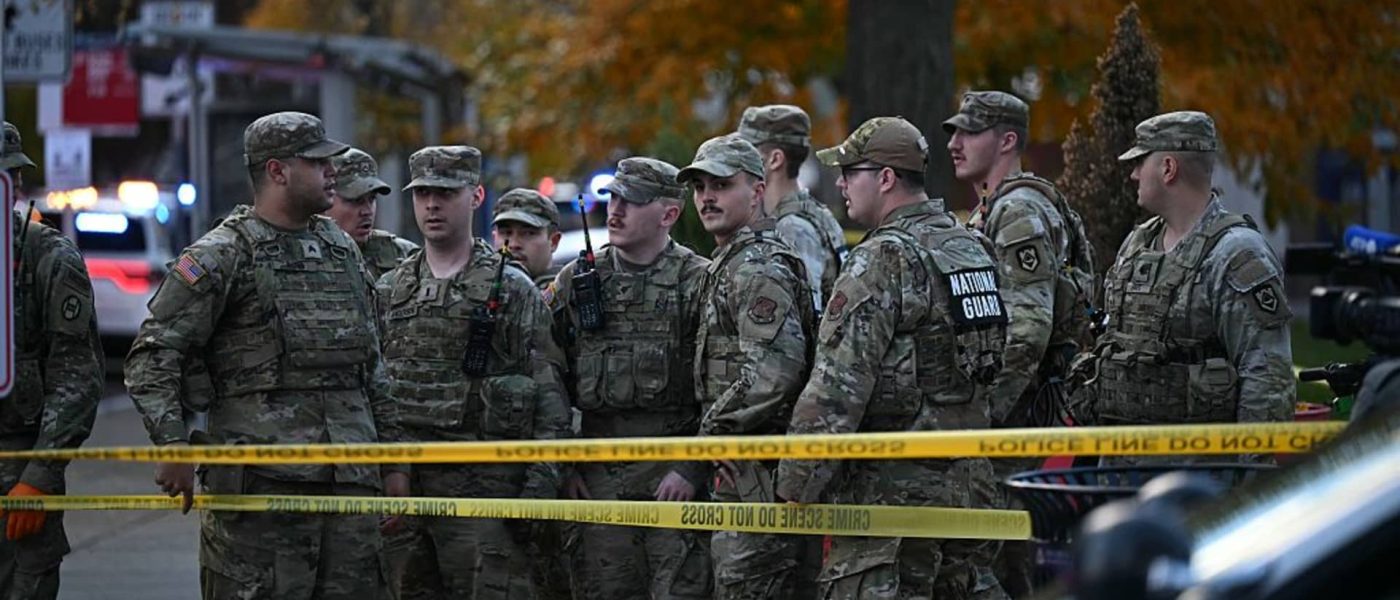 National Guard soldiers stand behind the crime scene tape at a corner in downtown Washington, DC, on November 26, 2025.