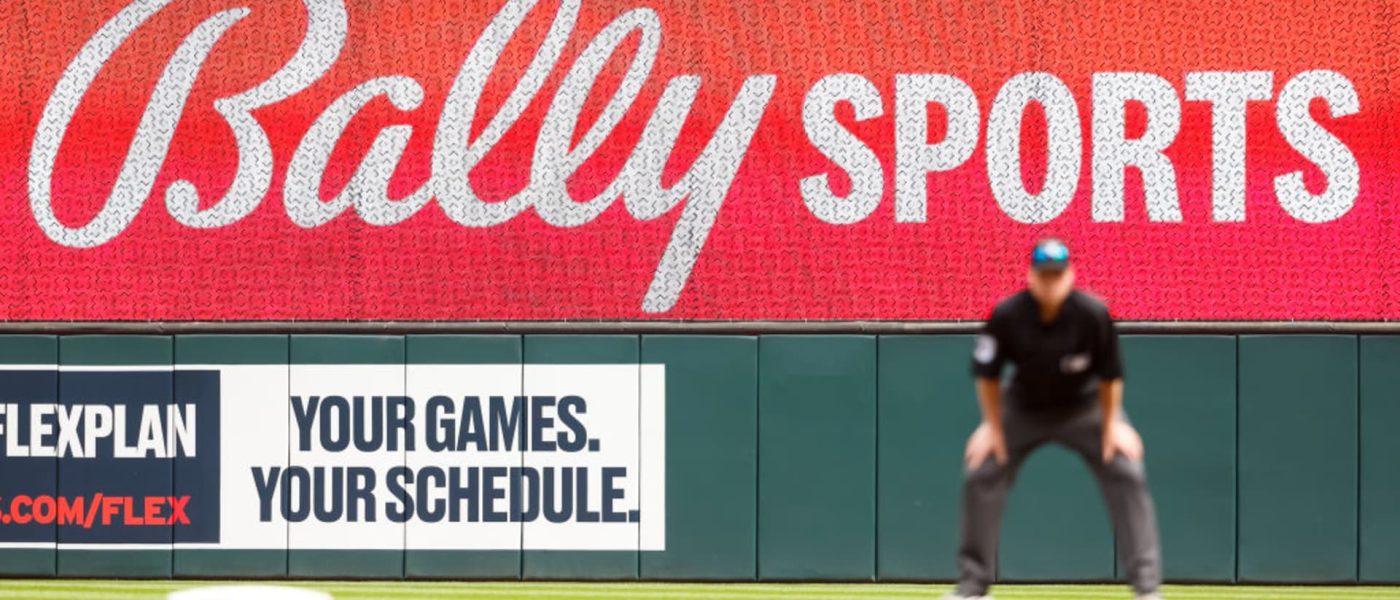 A Bally Sports display is shown in the eighth inning of the game between the MLB’s Houston Astros and Minnesota Twins at Target Field in Minneapolis, Minnesota, on April 9, 2023.