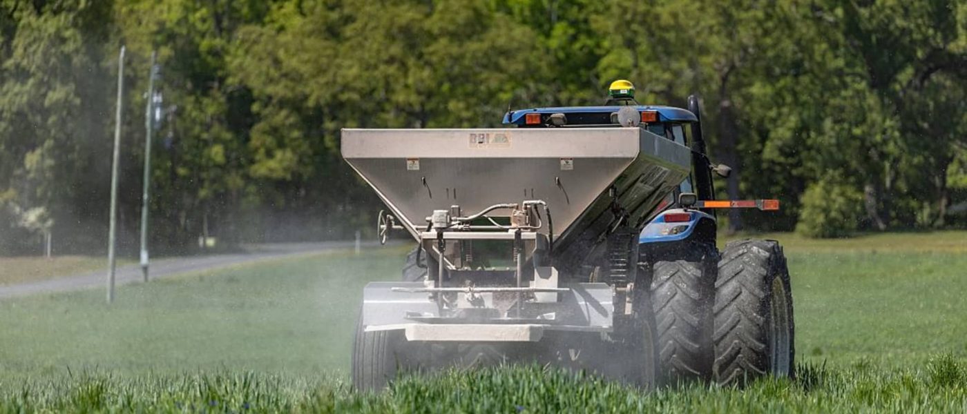 Fertilizer is spread across a field in China Grove, North Carolina, on April 10, 2026.