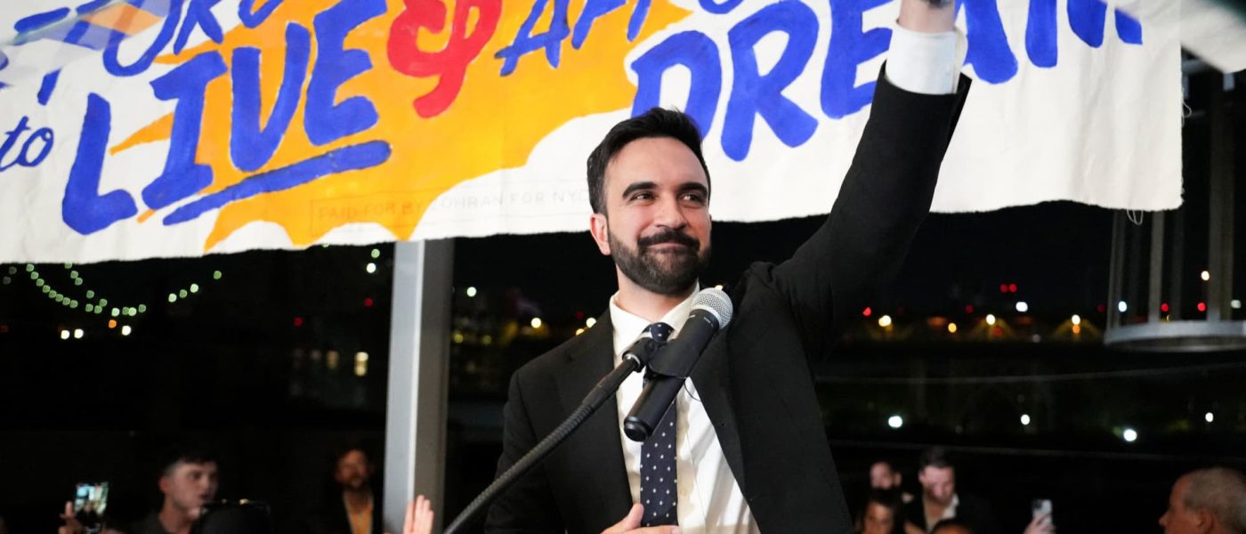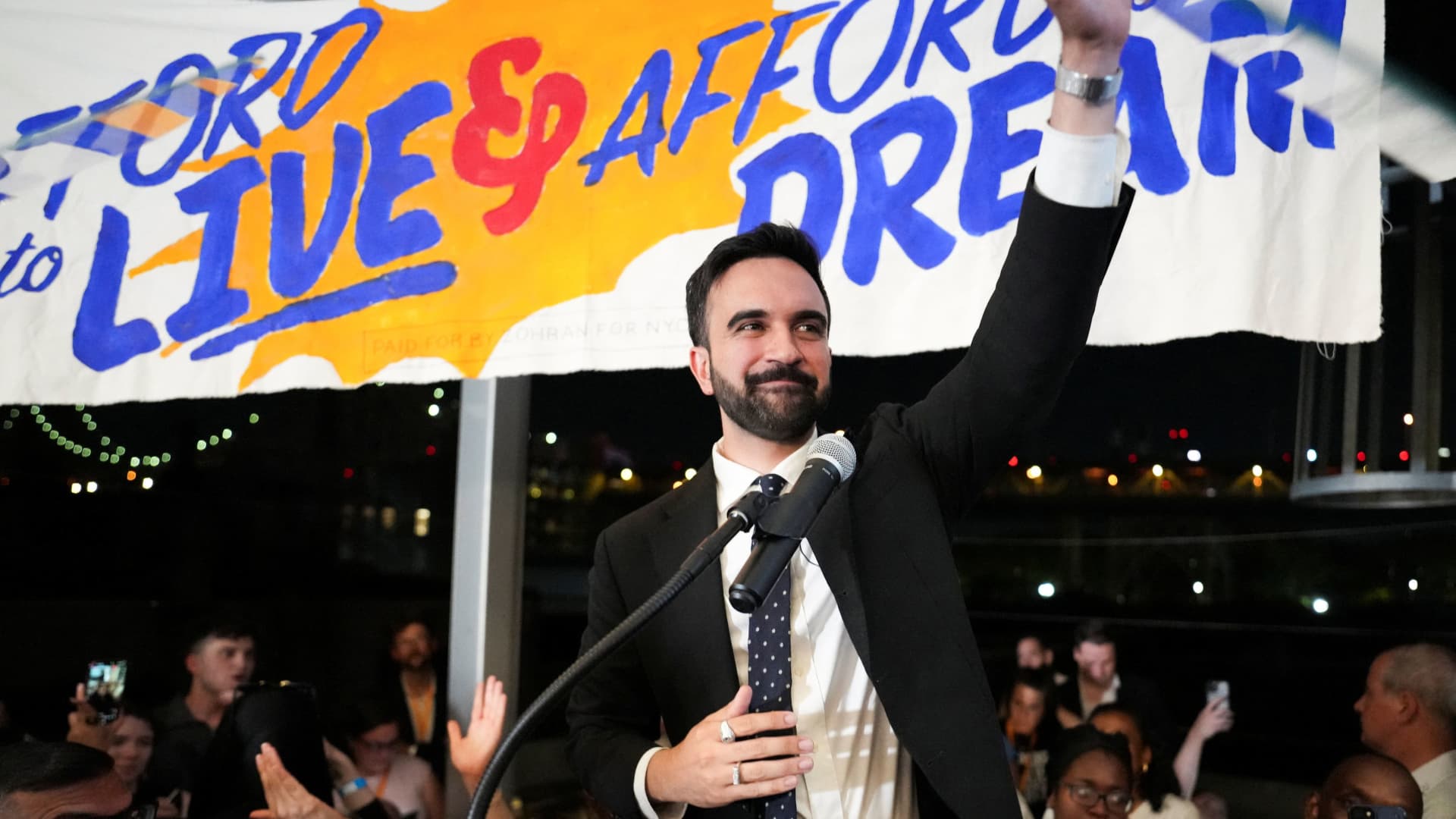 Zohran Mamdani gestures as he speaks during a watch party for his primary election, which includes his bid to become the Democratic candidate for New York City mayor in the upcoming November 2025 election, in New York City, U.S., June 25, 2025.