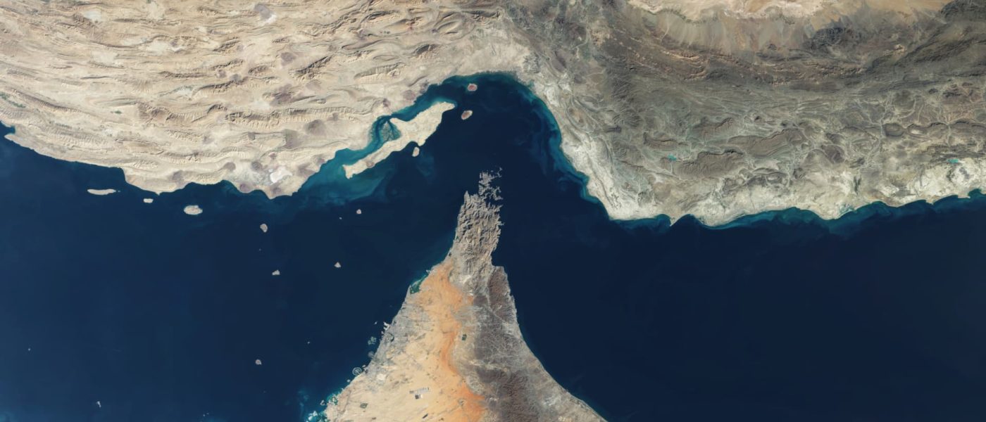 A satellite view of the Strait of Hormuz, a strategic waterway between Iran and Oman that links the Persian Gulf to the Arabian Sea.