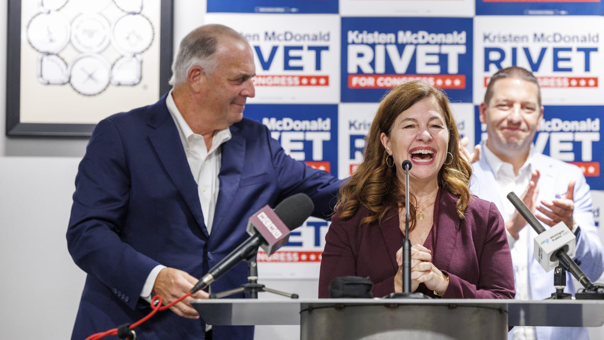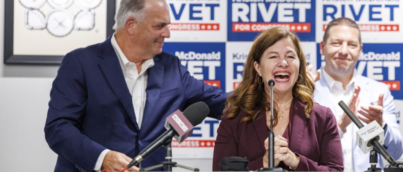 State Sen. Kristen McDonald Rivet addresses supporters of her campaign for Congress during a primary election night watch party in Saginaw, Michigan, on Aug. 6, 2024.