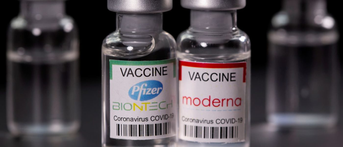 Vials with Pfizer-BioNTech and Moderna coronavirus disease (COVID-19) vaccine labels are seen in this illustration picture taken March 19, 2021.