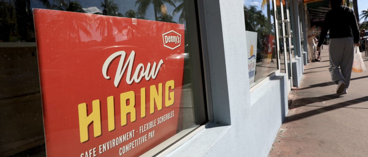 A ‘Now Hiring’ sign sits in the window of a Denny’s restaurant on Nov. 19, 2025 in Miami, Florida.