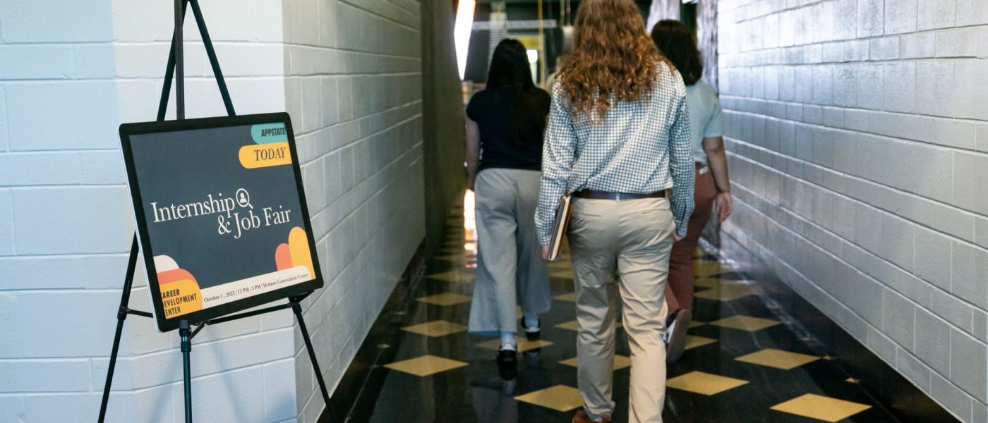 Job fair signage as job seekers arrive at the Appalachian State University internship and job fair in Boone, North Carolina, US, on Wednesday, Oct. 1, 2025.