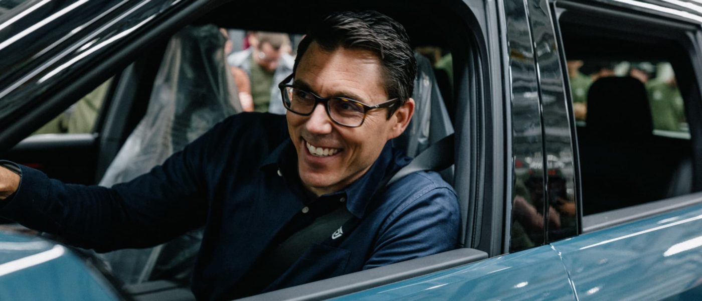 Rivian founder and CEO RJ Scaringe on April 22, 2026 drives the first customer-ready electric R2 SUV off the assembly line at the company’s plant in Normal, Illinois.