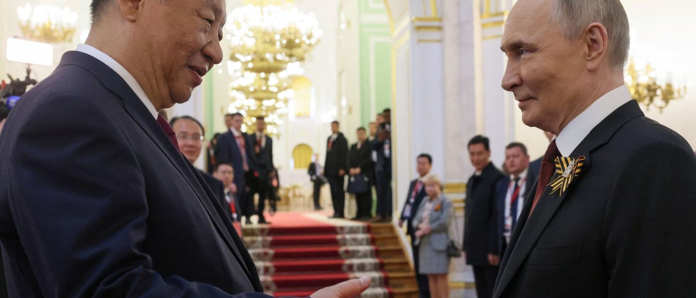 Russian President Vladimir Putin shakes hands with Chinese President Xi Jinping during a reception, held on Victory Day marking the 80th anniversary of the victory over Nazi Germany in World War Two, at the Kremlin in Moscow, Russia, May 9, 2025.