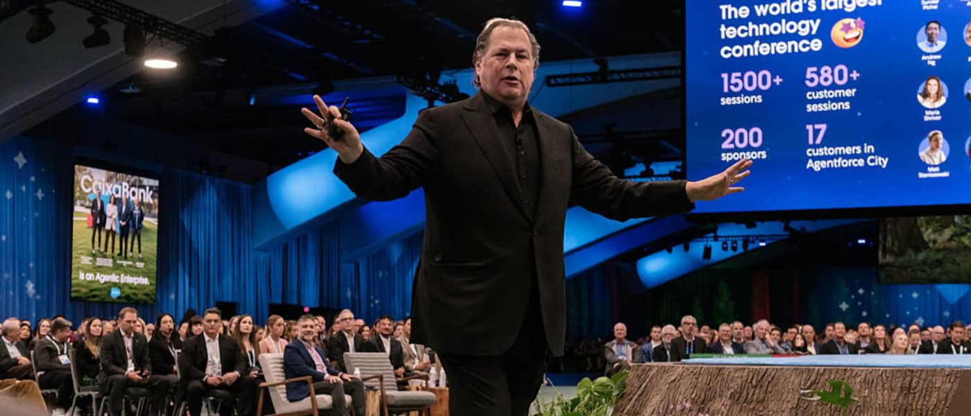Marc Benioff, chief executive officer of Salesforce Inc., speaks during the 2025 Dreamforce conference in San Francisco, California, US, on Tuesday, Oct. 14, 2025.
