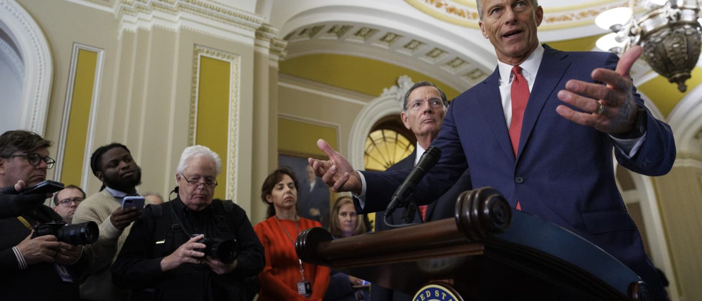Senate Majority Leader John Thune (R-S.D.) speaks to reporters during the Weekly Senate Policy Luncheon news conference on November 4, 2025 on Capitol Hill in Washington, DC.