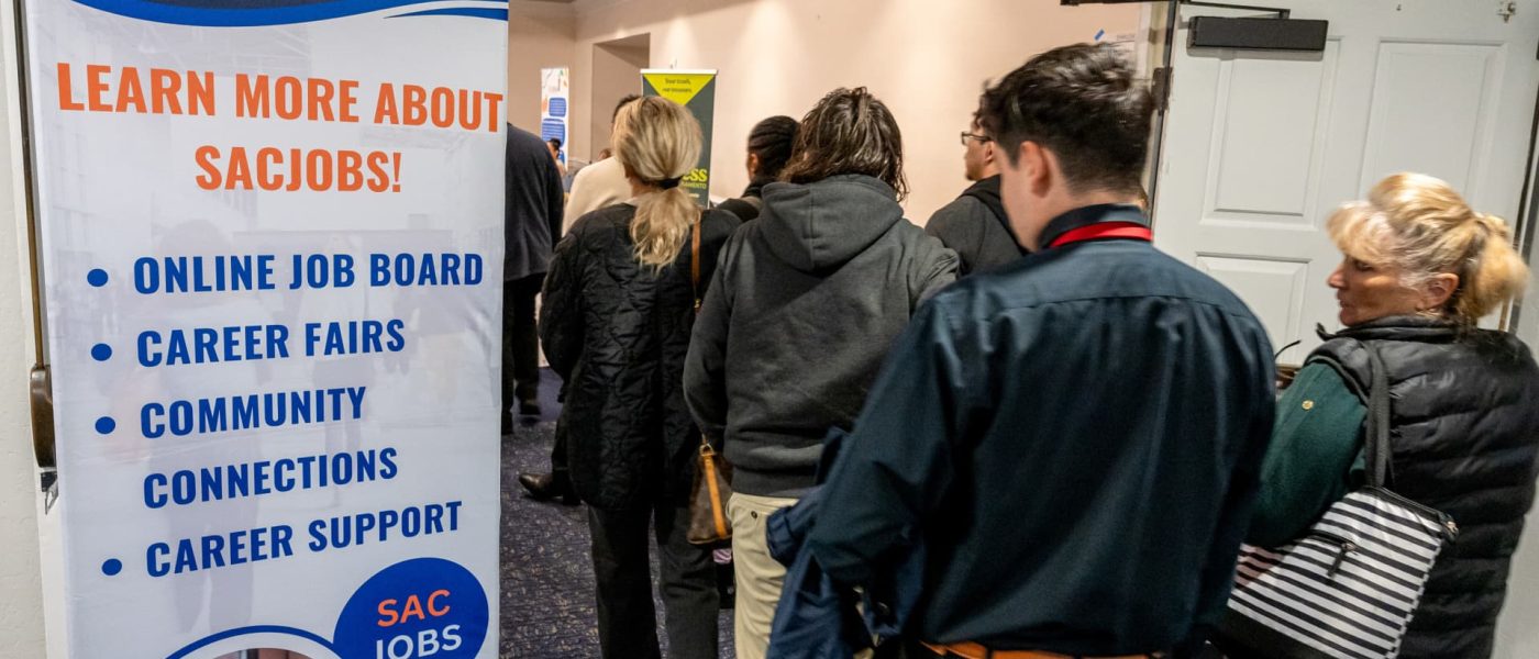 Job seekers wait to enter the SacJobs Career job fair in Sacramento, California, US, on Thursday, Nov. 13, 2025.