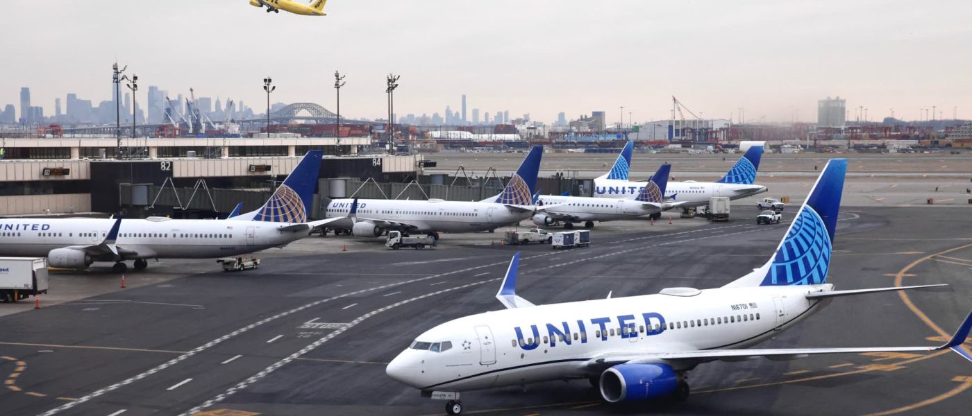 A Spirit Airlines jet takes off above two United Airlines airplanes at Newark Liberty Airport on March 23, 2018 in Newark, New Jersey.