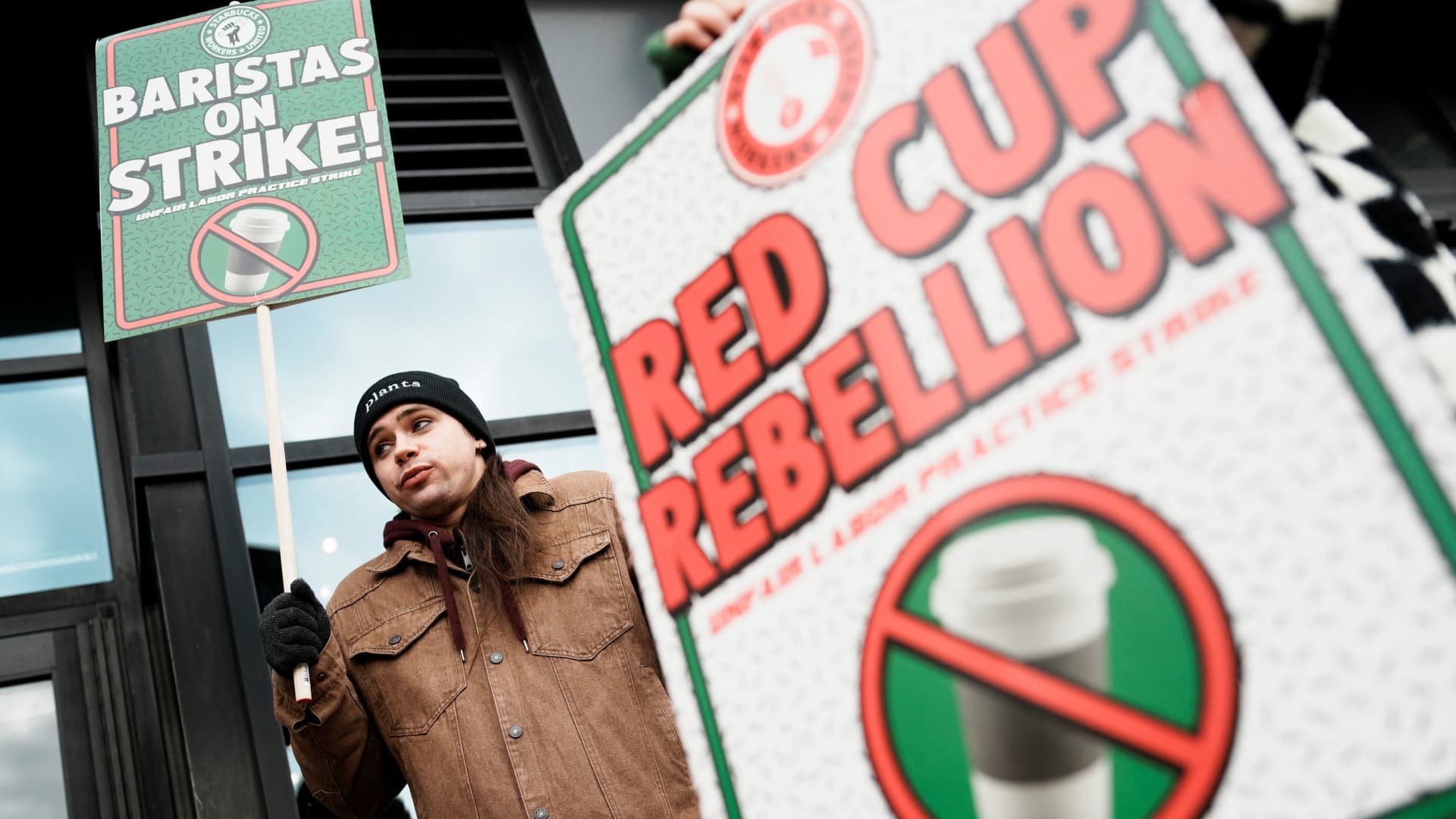 The protest, which the union says involves more than 1,000 baristas in over 65 stores, comes after Workers United voted to authorize an open-ended strike after baristas and the coffee giant failed to reach a collective bargaining agreement.