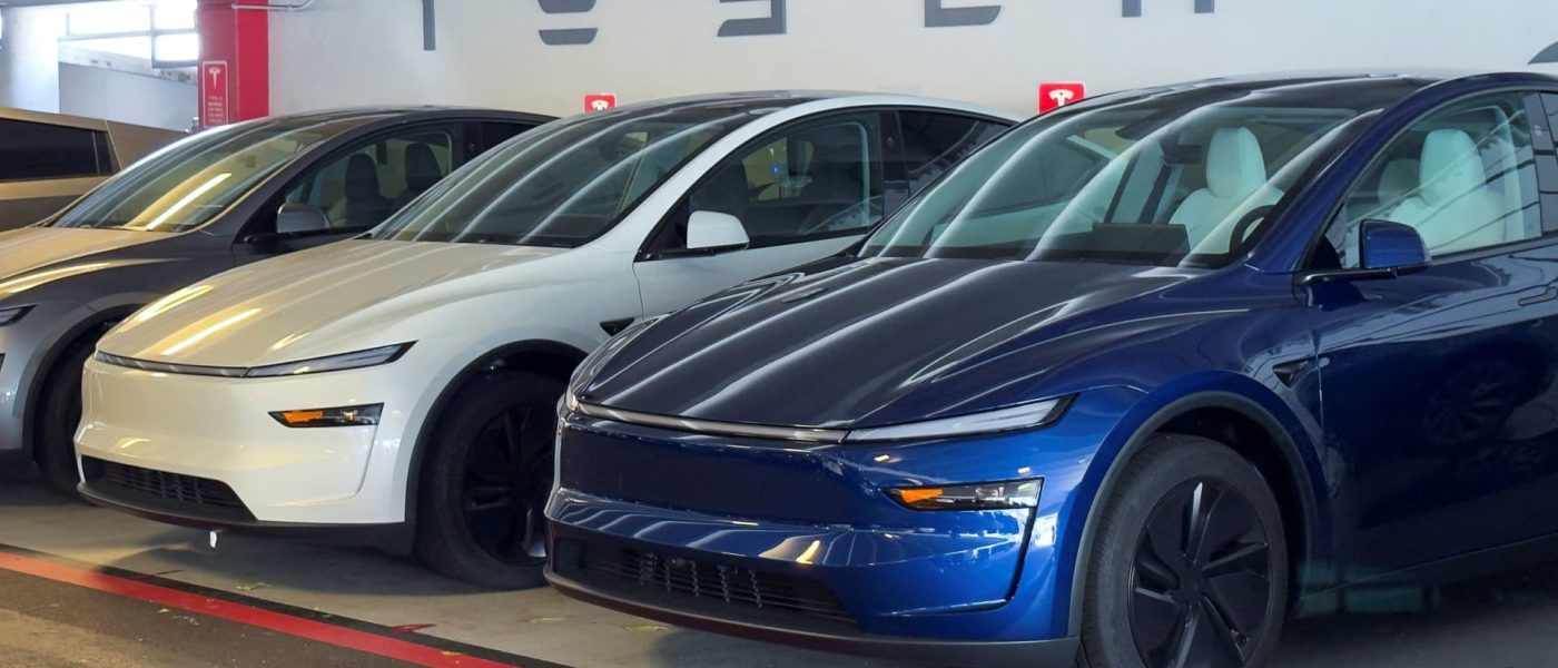 Refreshed versions of the Tesla Model Y are shown outside a Tesla store in San Diego, California, U.S. October 21, 2025.