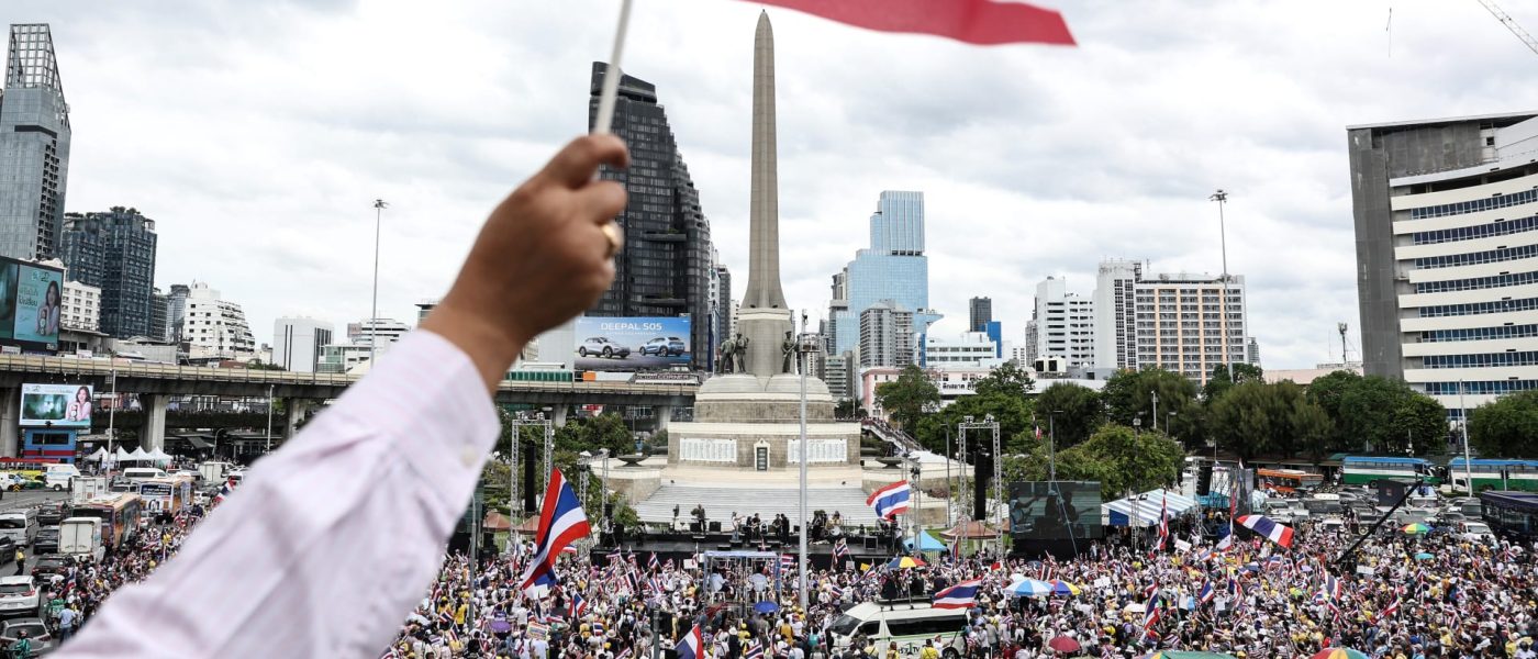 Protesters waved flags beside Victory Monument, a war memorial at a busy intersection, in a demonstration organised by the United Force of the Land, a coalition of largely nationalist activists who have rallied against other