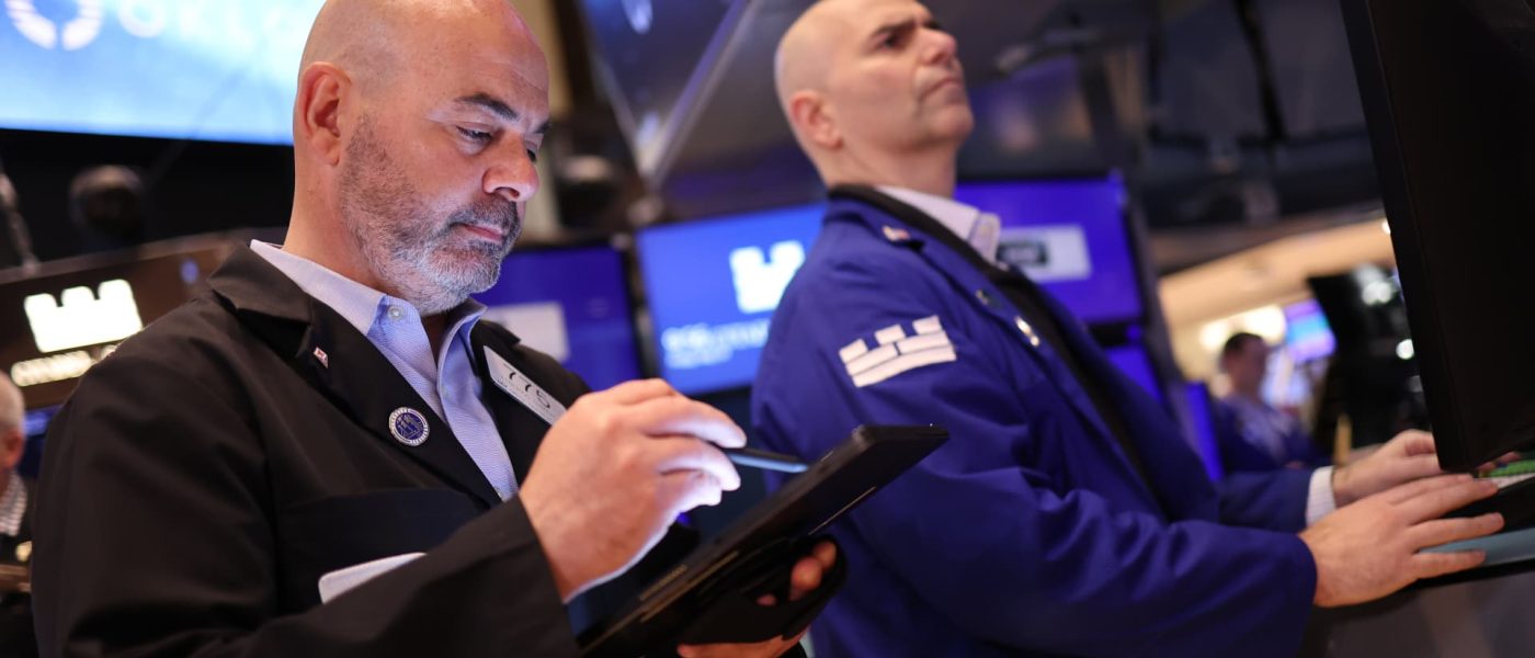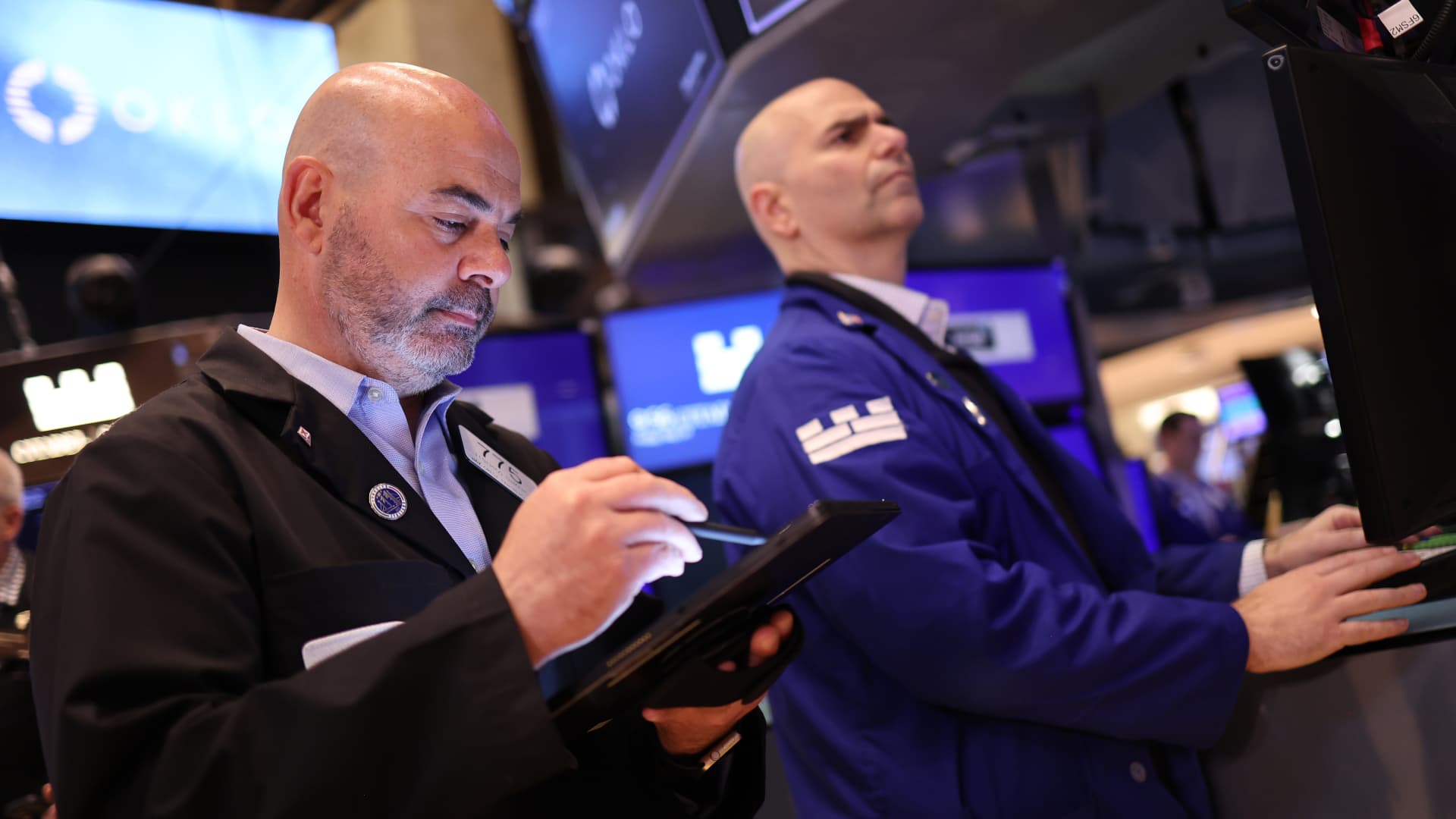 Traders work on the floor of the New York Stock Exchange during morning trading on May 24, 2024 in New York City.