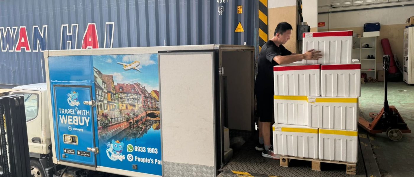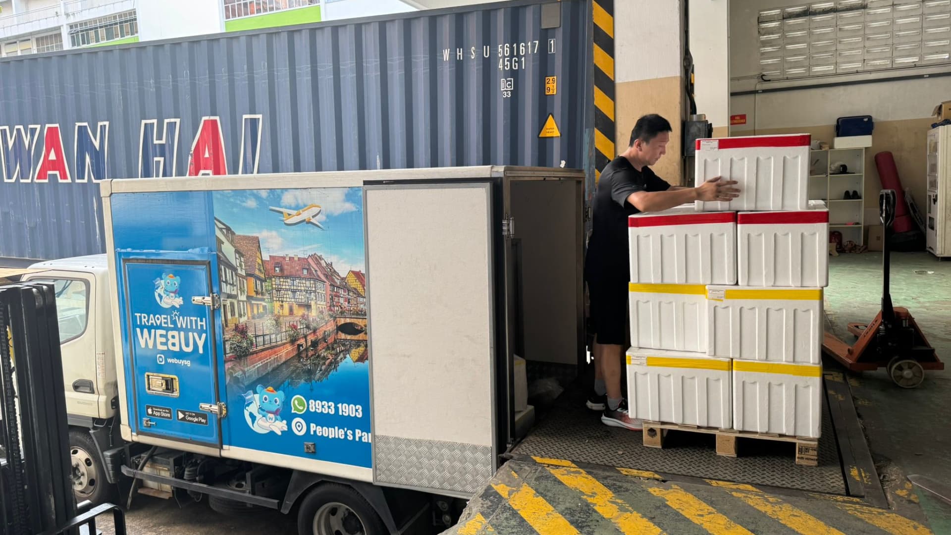 Singapore-based online grocery retailer Webuy staff is offloading containers filled with goods shipped from China.