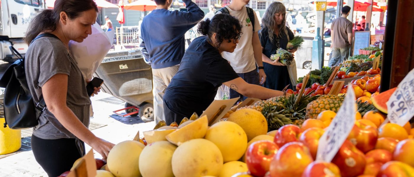 Shoppers look at fruit for sale at Frank’s Quality Produce Co. at Pike Place Market in Seattle, Washington, US, on Wednesday, May 28, 2025.
