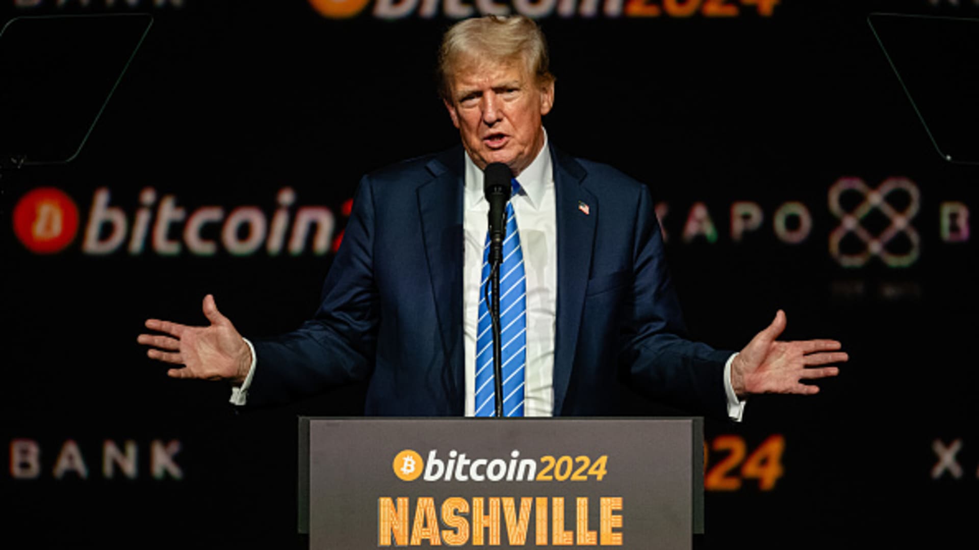 A cutout of President Donald Trump holding an image of a bitcoin is displayed in front of a group of servers during The Bitcoin Conference at The Venetian Las Vegas in Las Vegas, May 27, 2025.