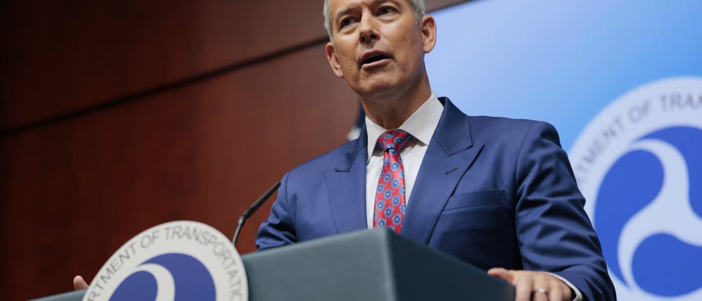 Transportation Secretary Sean Duffy speaks alongside FAA Acting Administrator Chris Rocheleau during a news conference at the Department of Transportation Headquarters on May 28, 2025 in Washington, DC.