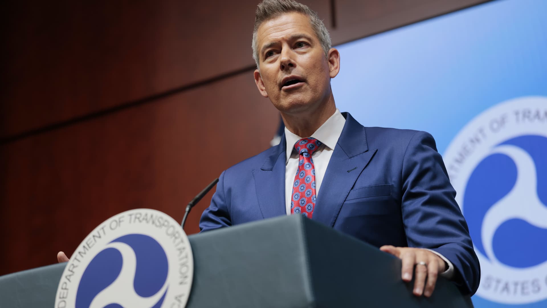 Transportation Secretary Sean Duffy speaks alongside FAA Acting Administrator Chris Rocheleau during a news conference at the Department of Transportation Headquarters on May 28, 2025 in Washington, DC.