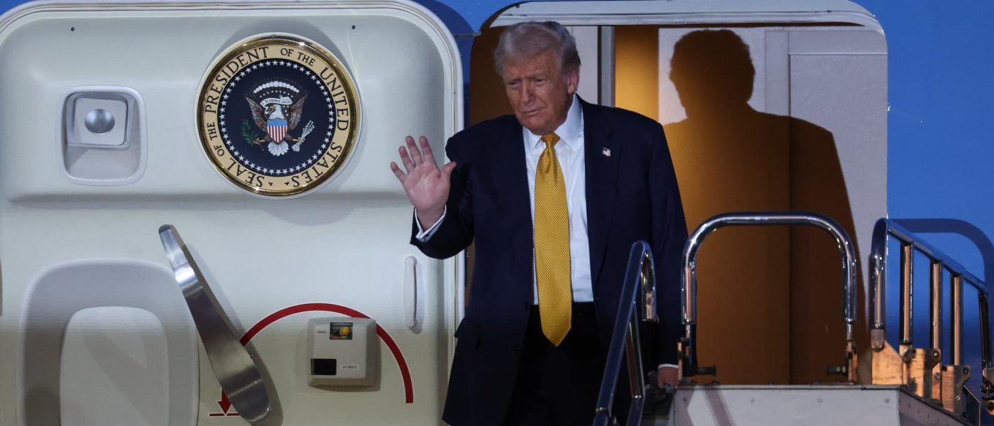 TOKYO, JAPAN – OCTOBER 27: U.S. President Donald Trump disembarks Air Force One as he arrives at Haneda Airport on October 27, 2025 in Tokyo, Japan.