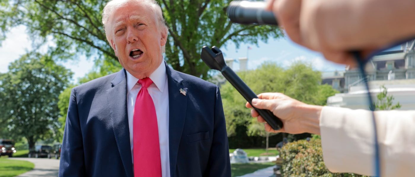 President Donald Trump speaks to the media before boarding Marine One on the South Lawn of the White House on April 16, 2026.
