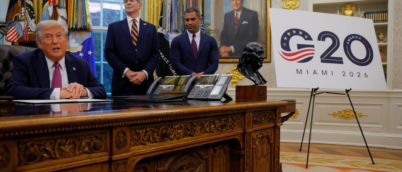 U.S. President Donald Trump speaks with the media about hosting the G20 summit, accompanied by U.S. Secretary of the Treasury Scott Bessent and Miami Mayor Francis Suarez, in the Oval Office, at the White House in Washington, D.C., U.S., September 5, 2025.