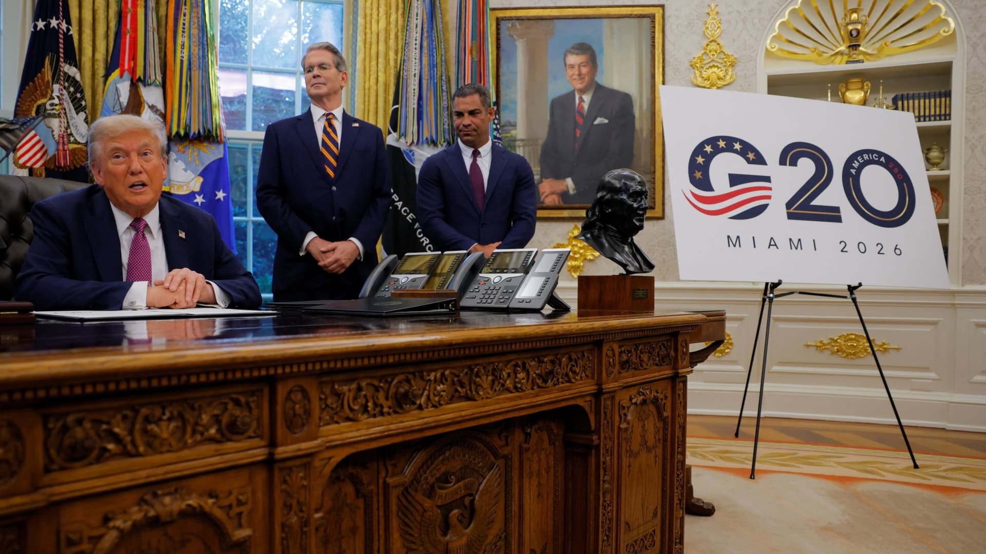 U.S. President Donald Trump speaks with the media about hosting the G20 summit, accompanied by U.S. Secretary of the Treasury Scott Bessent and Miami Mayor Francis Suarez, in the Oval Office, at the White House in Washington, D.C., U.S., September 5, 2025.