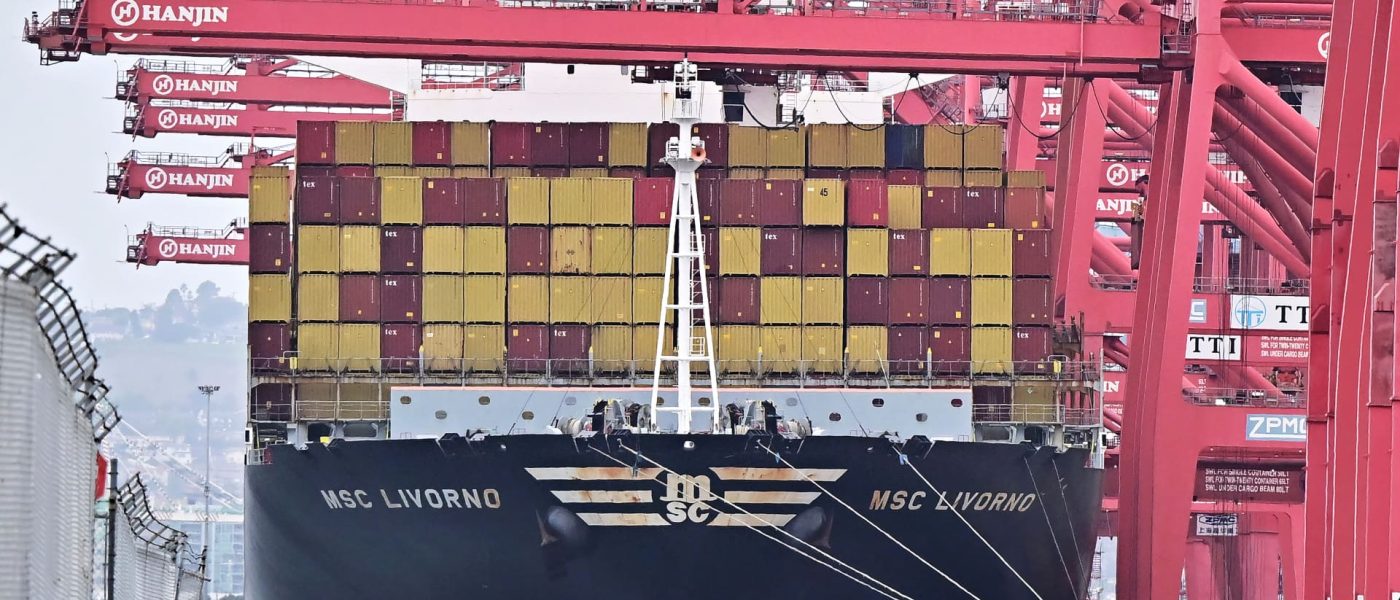 Shipping containers on the MSC Livorno await unloading at the Port of Long Beach, California on March 5, 2025, one day after US President Donald Trump.