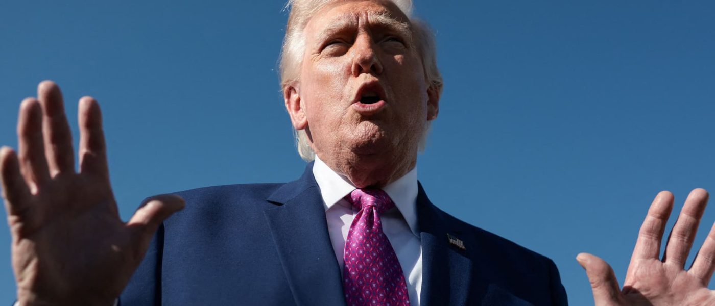 U.S. President Donald Trump speaks to the media, before boarding Air Force One on his way to Virginia, at Joint Base Andrews in Maryland, U.S., April 10, 2026.