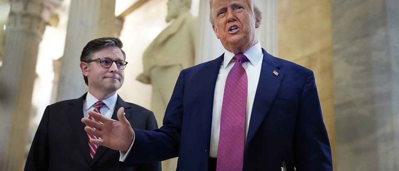 President Donald Trump arrives with Speaker of the House Mike Johnson (R-LA) for a House Republican meeting at the U.S. Capitol on May 20, 2025 in Washington, DC.