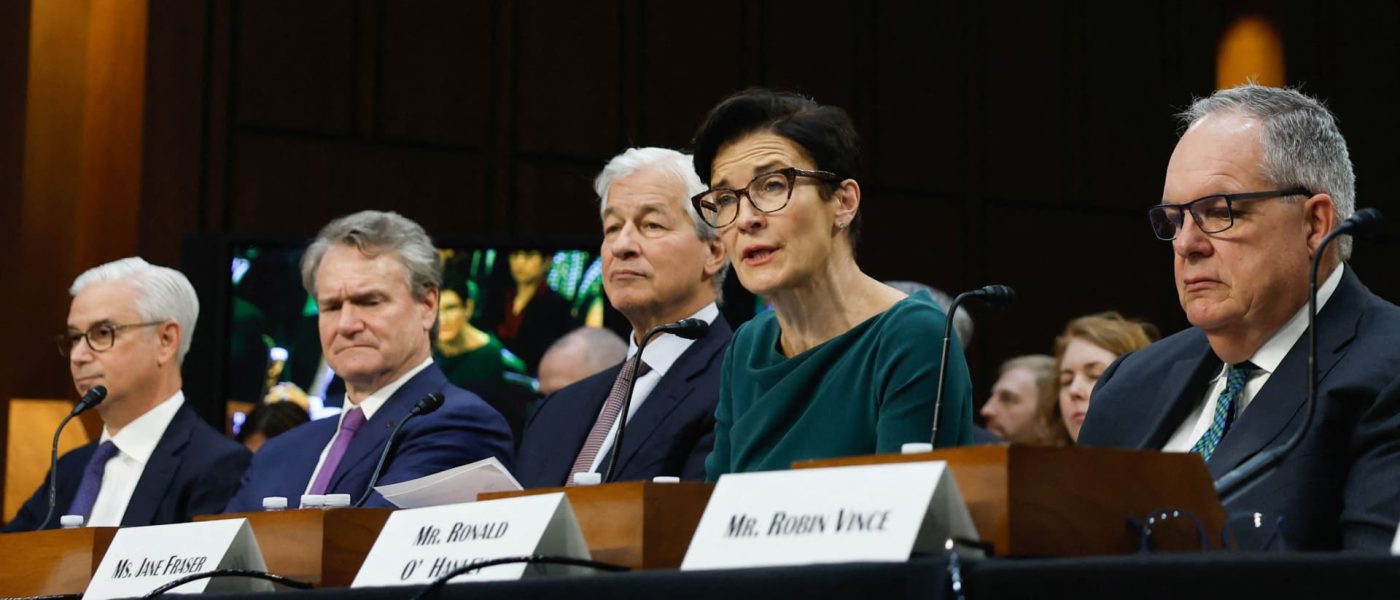 (L-R) Wells Fargo CEO and President Charles Scharf, Brian Bank of America Chairman and CEO Thomas Moynihan, JPMorgan Chase Chairman and CEO Jamie Dimon, Citigroup CEO Jane Fraser, State Street CEO Ronald OĆHanley, BNY Mellon CEO Robin Vince, Goldman Sachs CEO David Solomon and Morgan Stanley CEO James Gorman, testify during a Wall Street oversight hearing by the Senate Banking, Housing, and Urban Affairs committee on Capitol Hill in Washington, DC, December 6, 2023.