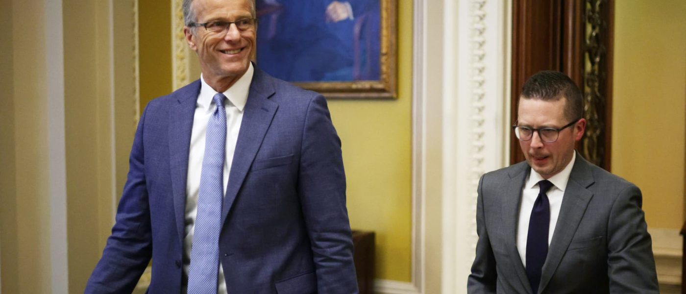 U.S. Senate Majority Leader John Thune, R-S.D., at left, walks off the Senate floor after the Senate stayed in session throughout the night at the U.S. Capitol Building in Washington, July 1, 2025.