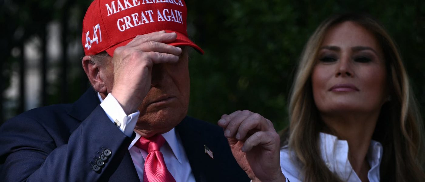 First Lady Melania Trump (C) looks on as U.S. President Donald Trump as he dons his MAGA hat before greeting members of the military and their families during the Military Family Picnic on the South Lawn of the White House in Washington, DC, on July 4, 2025.
