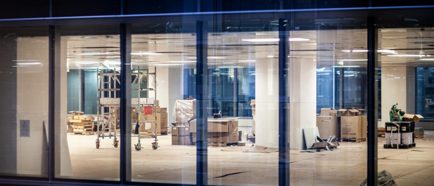 Construction renovation of new office in business building window at night