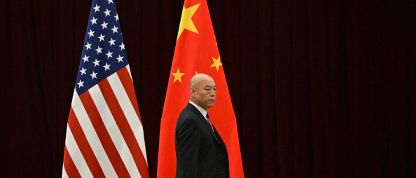 A man walks past China’s and USA’s flags before a meeting between US Treasury Secretary Janet Yellen and China’s Vice Premier He Lifeng at the Guangdong Zhudao Guest House in the southern Chinese city of Guangzhou, on April 5, 2024.