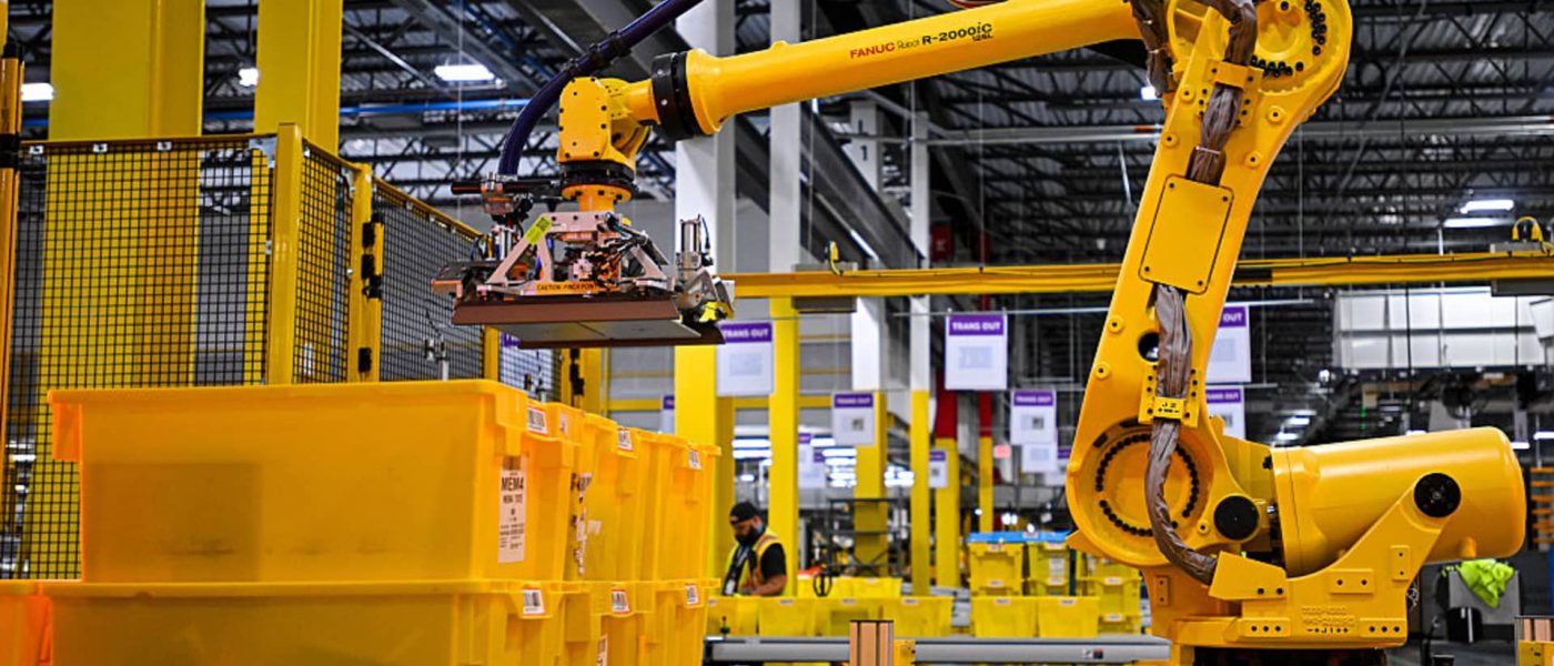 A Fanuc robotic arm moves bins of products during a media tour of the Amazon.com Inc. DAB2 fulfillment center in Daytona Beach, Florida, US, on Tuesday, Sept. 23, 2025. The DAB2 fulfillment center is Amazon’s seventh robotics fulfillment center in Florida. Photographer: Miguel J. Rodriguez Carrillo/Bloomberg via Getty Images