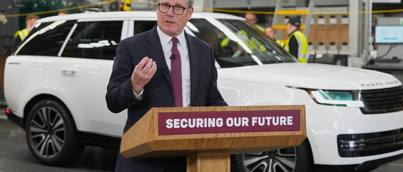 Prime Minister Keir Starmer speaks during a visit to a Jaguar Land Rover car factory on April 7, 2025 in Birmingham, United Kingdom.
