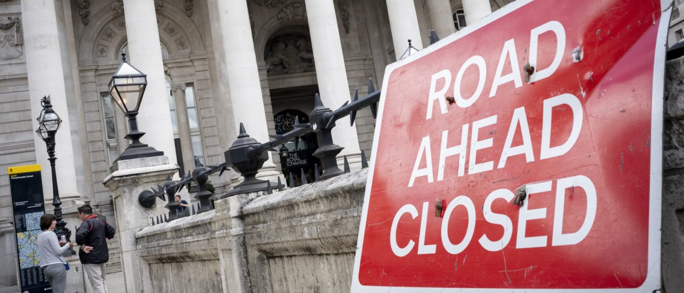 A road closure sign leans against a wall outside Royal Exchange in the heart of the City of London, on 13th June 2022, in London, England.