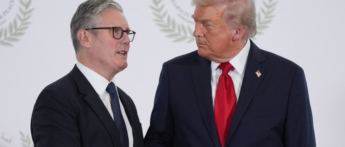 US President Donald Trump greets Britain’s Prime Minister Keir Starmer during a summit on Gaza, Egypt, in Sharm el-Sheikh on Oct. 13, 2025.