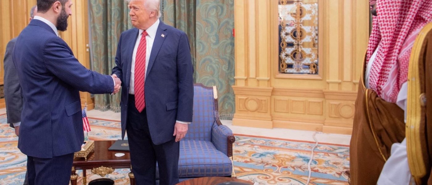U.S. President Donald Trump meets with Syrian President Ahmed al-Sharaa in Riyadh, Saudi Arabia, in this handout released on May 14, 2025.