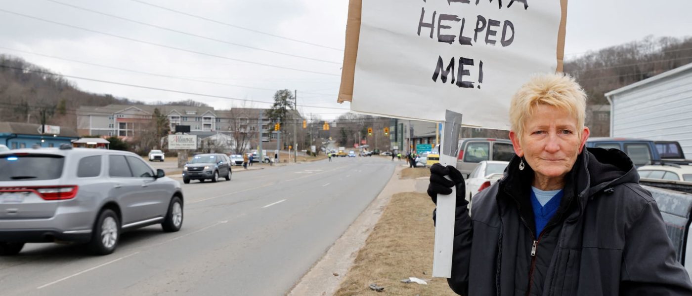 Swannanoa resident Lucy Bickers, who received assistance from FEMA after Hurricane Helene damaged her property, holds a sign in support of the government disaster agency as she waits on the route of visiting U.S. President Donald Trump’s motorcade in Swannanoa, North Carolina, U.S., January 24, 2025.