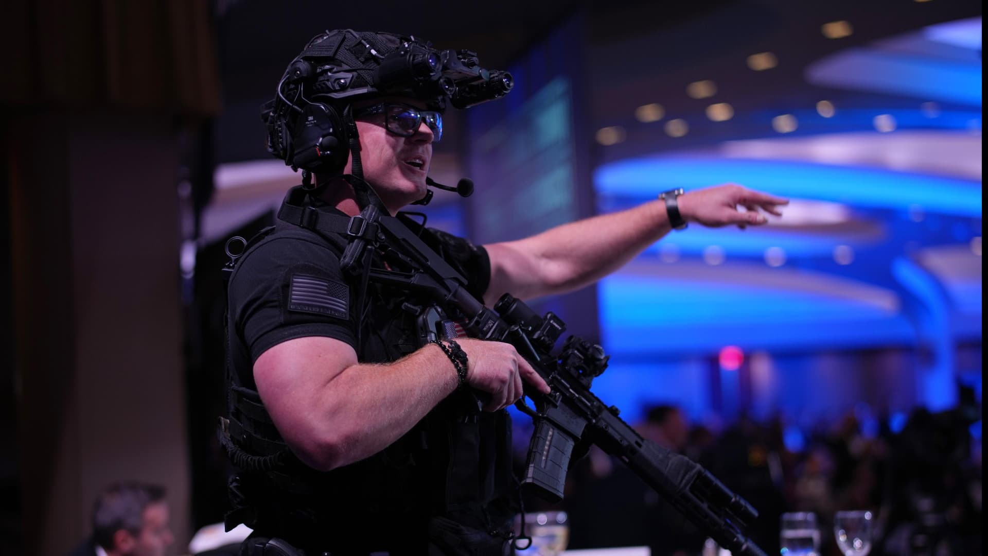The U.S. Secret Service maintained another perimeter around the president, including a buffer separating him and others seated at the head table from the rest of the attendees. Armored plates were hidden under the table where Trump was seated. Secret Service agents were at their posts in front of the stage and in its wings, as were heavily armed counter-assault agents ready to respond to threats. Security details for dozens of other high-profile attendees were also in the ballroom.